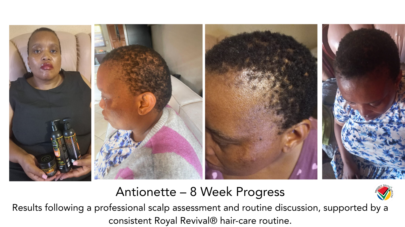 “My name is Thakhani Manugeni , a mother of a 5-year-old girl, soon to be 6 years in November. She had a problem with dandruff and a very itchy scalp. I tried so many products, but it was just temporary solving. I was introduced to Royal Revival Haircare products. Wow – I started with the hair food and anti-dandruff spray oil , twice a day in the morning and at night. I was happy with the results. We then included the keratin shampoo and conditioner. Her scalp was so clean and her and I am so happy because her scalp is no longer itchy like before I will continue to use this range for my daughter’s hair. Thank you so much.”